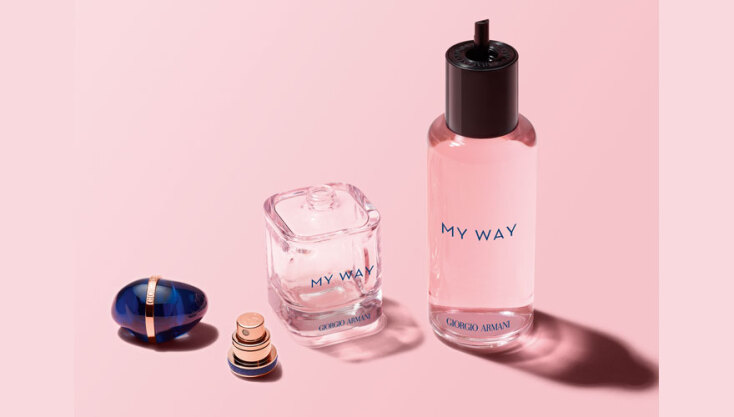 Για πρώτη φορά στον κλάδο της υψηλής αρωματοποιίας, παρουσιάζεται ένα πρωτοποριακό και καθαρό σύστημα εύκολου refill, χωρίς τη χρήση χωνιού. Ο οίκος ομορφιάς Giorgio Armani, προσφέρει συνδυαστικά, ένα μπουκάλι αρώματος MY WAY των 50ml και ένα ανταλλακτικό μπουκάλι των 150ml. Έτσι, εξασφαλίζεται 55% μείωση της χρήσης γυαλιού, 64% μείωση της χρήσης πλαστικού, 75% μείωση της χρήσης μετάλλου και 32% μείωση της χρήσης χαρτονιού, σε σύγκριση με τη χρήση τεσσάρων μπουκαλιών αρώματος των 50ml. Στις συσκευασίες χρησιμοποιούνται ανακυκλωμένα υλικά μετά από την κατανάλωση (PCR), γυαλί, πλαστικό και μέταλλο, ενώ τα μέρη του αρχικού αρώματος μπορούν να διαχωριστούν, προκειμένου τα στοιχεία από μέταλλο και γυαλί να ανακυκλώνονται στα αντίστοιχα εργοστάσια. Πέρα από το ίδιο το άρωμα MY WAY, ενσωματώνονται βιώσιμες αξίες στη σχεδίαση και στα υλικά των σημείων πώλησης και των καταστημάτων λιανικής, με τη χρήση πιστοποιημένου χαρτιού και χαρτονιού από δάση βιώσιμης διαχείρισης (FSC/PEFC), ανακυκλωμένων υλικών, και την ελαχιστοποίηση της κατανάλωσης ενέργειας.