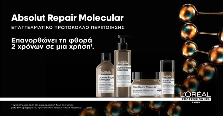 Η περιποίηση των μαλλιών εξαρτάται άμεσα από τη συνέπεια της ρουτίνας περιποίησής σου και την επιλογή των κατάλληλων προϊόντων για τις ανάγκες των μαλλιών σου. Η L'Oréal Professionnel φέρνει την επανάσταση στην περιποίηση μαλλιών με την πρωτοποριακή σειρά Absolut Repair Molecular. Τα προϊόντα της σειράς, παρέχουν κάτι πολύ περισσότερο από επιφανειακή επανόρθωση, καθώς στοχεύουν και ενδυναμώνουν την μοριακή δομή των μαλλιών.