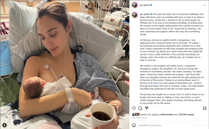 Η Γκαλ Γκαντότ αποφάσισε να μοιραστεί την περιπέτειά της, κάνοντας τον απολογισμό της χρονιάς που φεύγει, αλλά και «καθώς γιορτάζουμε το Χανουκά, μια γιορτή φωτός και θαυμάτων, σκέφτομαι το προσωπικό θαύμα που βίωσα. Η κόρη μου, Όρι, είναι μια συνεχής υπενθύμιση για την αντοχή, την ελπίδα και τη δύναμη που κρύβουμε μέσα μας. Εύχομαι να βρούμε όλοι το φως μας, να ζήσουμε τα δικά μας θαύματα και να συνεχίσουμε να αγωνιζόμαστε για την υγεία μας και ο ένας για τον άλλον».