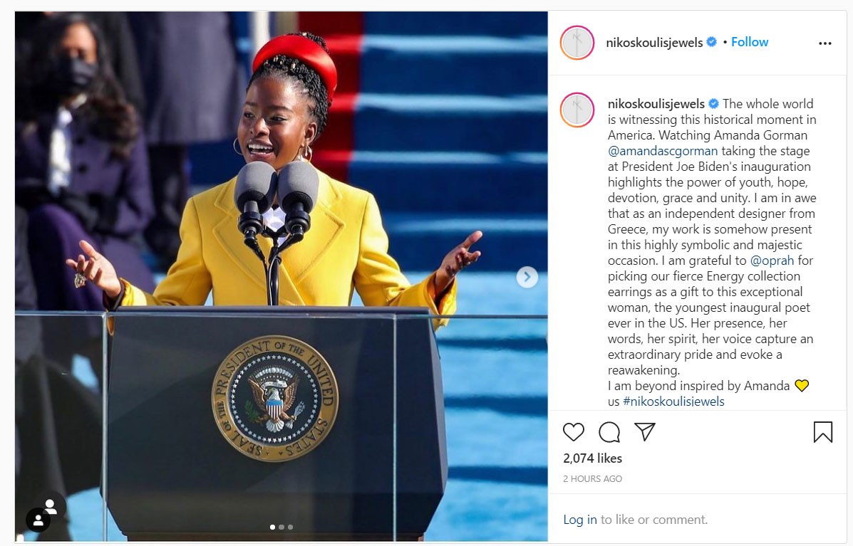 Σε ανάρτησή του, ο σχεδιαστής κοσμημάτων δήλωσε ευγνώμων «που επιλέξαμε με την Οπρα τα σκουλαρίκια από την Energy collection ως δώρο σε αυτήν την εξαιρετική γυναίκα, τη νεότερη ποιήτρια σε ορκωμοσία των ΗΠΑ».