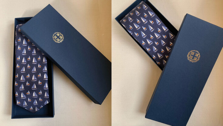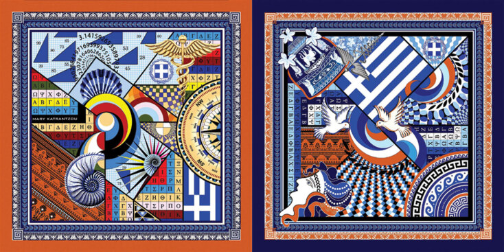 Αξίζει να σημειώσουμε ότι τα σχέδια επιμελήθηκε και προσέφερε αφιλοκερδώς η Μαίρη Κατράντζου. Τα θέματα της συλλογής των μαντηλιών περιλαμβάνουν στοιχεία του Μινωϊκού πολιτισμού, γραμματοσειρές της ελληνικής αλφαβήτου, παραστάσεις αγγείων, περιστέρια, μαιάνδρους, τη γαλανόλευκη κ.ά. Τα χρώματα που χρησιμοποιήθηκαν είναι καθαρά ελληνικά: το μπλε της θάλασσας, το γαλάζιο του ουρανού, το λευκό, της τερακότας, το κόκκινο και το κίτρινο. Οι εικόνες παραπέμπουν στη σύνδεση της σύγχρονης Ελλάδας με το ιστορικά πλούσιο παρελθόν της. Αντίστοιχα οι γραβάτες απεικονίζουν ζευγάρια περιστεριών που κρατούν στο στόμα τους ένα κλωνάρι ελιάς και μικρά ιστιοφόρα.