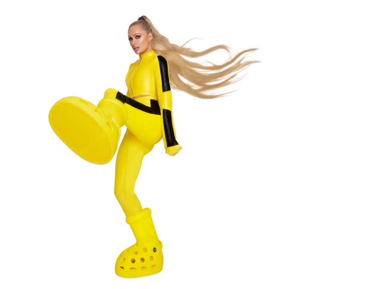 Οι κίτρινες μπότες έχουν εξίσου καρτουνίστικο στιλ, που χαρακτηρίζεται από ένα ογκώδες επάνω τμήμα και τις τρύπες που συναντούμε στα Classic Clogs της Crocs. Στο ύψος της φτέρνας έχουν τον γνωστό ιμάντα με το λογότυπο των Crocs.