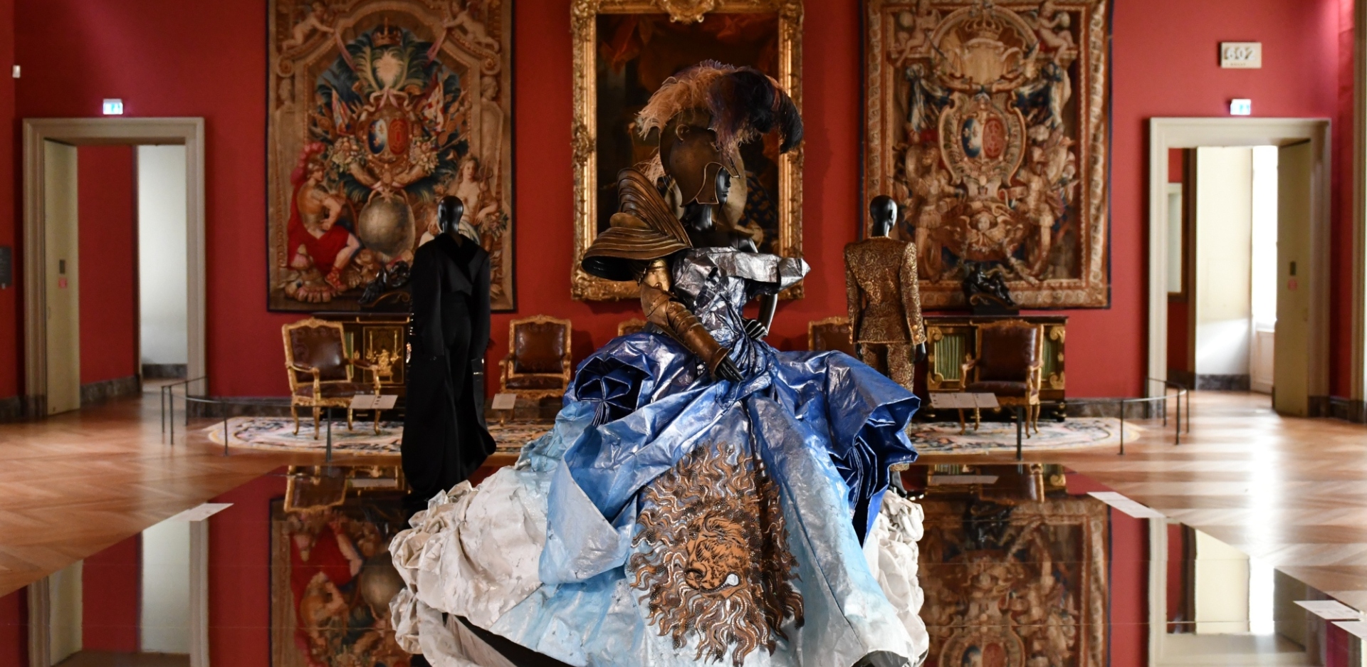 Η ενότητα για τη Βυζαντινή περίοδο και τον Μεσαίωνα παρουσιάζει χρυσοποίκιλτα έργα τέχνης πλάι σε ενδύματα που θα μπορούσαν να έχουν φορεθεί είτε από τον Ιουστινιανό είτε από μοντέλο του Ζαν Πολ Γκοτιέ με την ίδια παγερή έκφραση μεγαλείου. Οι αίθουσες του Αναγεννησιακού Λούβρου γεμίζουν από περίτεχνα φλοράλ, τελετουργικά φτερά και ψηφιακές δαντέλες, σε έναν αμφίδρομο διάλογο με εμαγιέ κεραμικά, στολισμένες πανοπλίες και ταπισερί που φλερτάρουν με τη σουρεαλιστική υπερβολή.