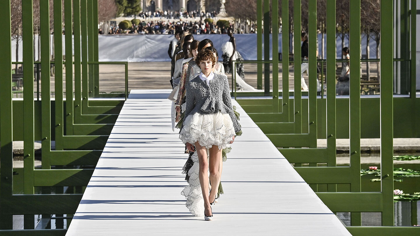 Η επίδειξη του Dior πραγματοποιήθηκε στους Κήπους του Τουιλερί στο Παρίσι, πάνω από μια οκταγωνική λίμνη, σε ένα σκηνικό που ενίσχυε το φυσικό θέμα της συλλογής. Στην πασαρέλα εμφανίστηκαν αέρινα φορέματα που θύμιζαν άνθη, ενώ σε ορισμένα παπούτσια υπήρχαν διακοσμήσεις εμπνευσμένες από νούφαρα.
