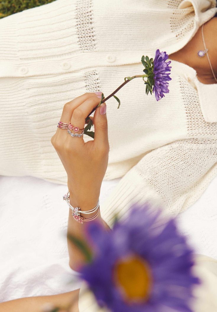 Προσθέστε μια ανάλαφρη πινελιά σε κάθε ανοιξιάτικη εμφάνιση με τα νέα κομψά δαχτυλίδια και charms της PANDORA. Αυτή τη σεζόν η νέα μωβ απόχρωση κάνει την παρθενική της εμφάνιση στα purple charms, σχέδια που συμπληρώνουν μοναδικά το στιλ Pink Daisy.