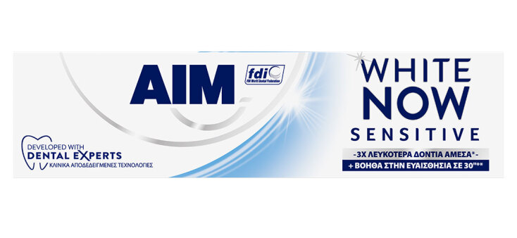 Τίποτα δεν μπορεί να σταθεί εμπόδιο μπροστά στο λευκό χαμόγελο που επιθυμείς – ούτε καν η ευαισθησία των δοντιών σου. Για αυτό φροντίζει η νέα AIM White Now Sensitive, ένα διπλά αποτελεσματικό προϊόν που σε βγάζει από το δίλημμα να επιλέξεις μεταξύ λευκότερου χαμόγελου¹ και ανακούφισης από ευαισθησία². Η νέα ήπια σύνθεση της οδοντόκρεμας White Now Sensitive συμβάλλει στην υγεία των δοντιών καθώς βασίζεται σε δύο κλινικά αποδεδειγμένες τεχνολογίες: η White- Correct Technology προσφέρει άμεσο αποτέλεσμα για τρεις φορές λευκότερο χαμόγελο¹, ενώ την ίδια στιγμή η ActivRelief Technology, με σύμπλεγμα μεταλλικών στοιχείων, βοηθά στην ανακούφιση από τον πόνο που προκαλείται στα ευαίσθητα δόντια σε μόλις 30 δευτερόλεπτα².