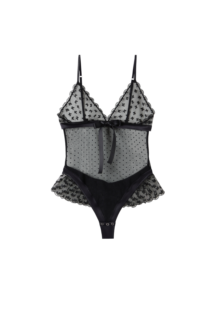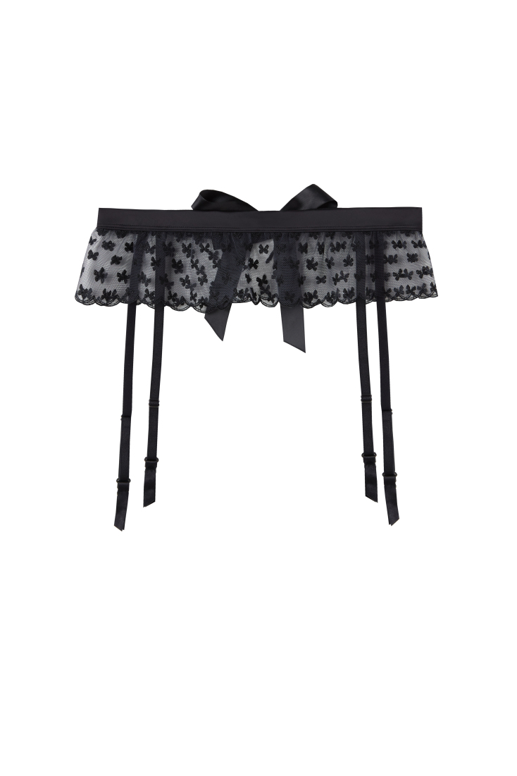 Τέλος, το μαύρο τούλι εμπλουτίζεται με κεντήματα με μοτίβα από κορδέλα: τρίγωνα σουτιέν, ζαρτιέρες και κορμάκια δημιουργούν μία παιχνιδιάρικη θηλυκότητα που είναι ωστόσο σαγηνευτική όταν φοριέται με ένα έντονο κόκκινο μεταξωτό κιμονό.