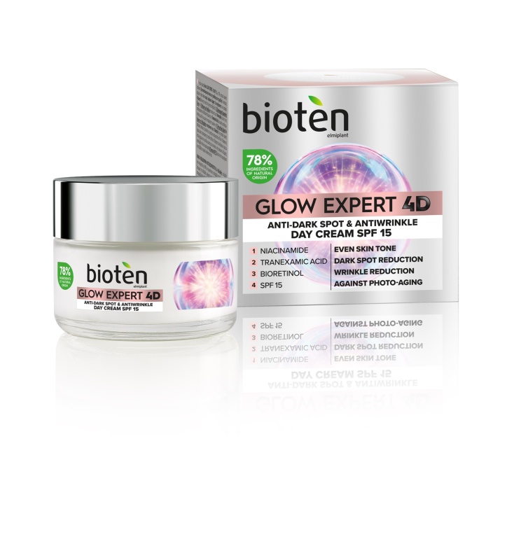 - κρέμα ημέρας bioten Glow Expert 4D SPF 15 με 78% συστατικά φυσικής προέλευσης, δρα αποτελεσματικά ενάντια στις πανάδες και στις ρυτίδες, χάρη στη νιασιναμίδη, το τρανεξαμικό οξύ και τη βιο-ρετινόλη. Ταυτόχρονα είναι ενισχυμένη με SPF15 ώστε να προστατεύει την επιδερμίδα ενάντια στη φωτογήρανση και τις βλάβες που προκαλεί η έκθεση στον ήλιο.