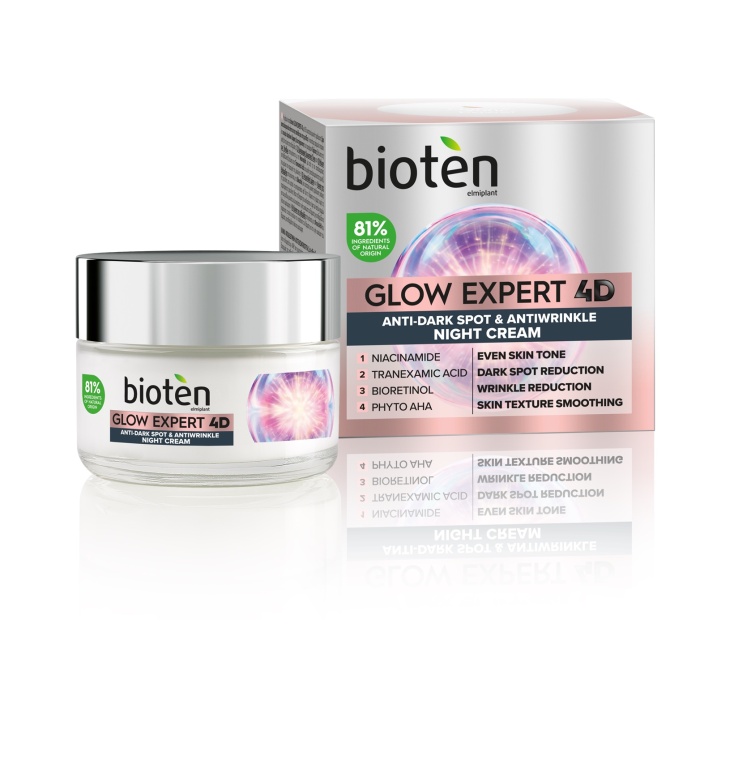 - κρέμα νύχτας bioten Glow Expert 4D με 81% συστατικά φυσικής προέλευσης περιέχει ένα ισχυρό σύμπλοκο συστατικών, όπως η νιασιναμίδη, το τρανεξαμικό οξύ, τη βιο-ρετινόλη και τα phyto AHA που προσφέρουν αντιγηραντική δράση και λάμψη.