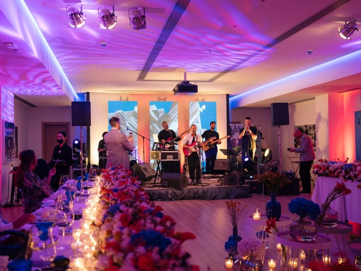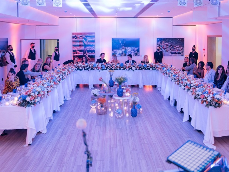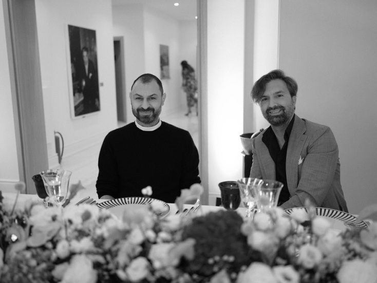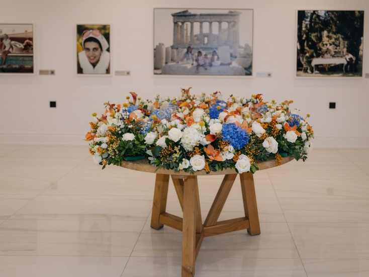 Οι φωτογραφίες είναι στημένες και στον χώρο που θα γίνει το καθιστό δείπνο και το live του Monsieur Minimal, όπως προανέφερα. Τα λουλούδια είναι οι πρωταγωνιστές που υπογραμμίζουν τη διεισδυτική ματιά του Aarons: στρουμπουλές ορτανσίες, οι αγαπημένοι μου λυσίανθοι, τριαντάφυλλα και κάλλες χαϊδεύουν το τραπέζι που έχει στηθεί σε σχήμα Π. Κάθομαι δίπλα στην Ελίνα, την αδερφή του Γιώργου και συνιδιοκτήτρια του Abaton Island που με περίσσιο μεράκι έστησε τον χώρο. Οι ghost chairs και τα bread and butter πιατάκια ήρθαν από την Αθήνα προκειμένου να καταφέρουν να αποδώσουν την ατμόσφαιρα ενός τραπεζιού που είχε απαθανατίσει ο Aarons σε μια φωτογραφία κι αποτέλεσε την έμπνευσή της. «Δεν είστε καλά», της λέω αυθόρμητα αλλά και με θαυμασμό για την επιμονή στη λεπτομέρεια και η φράση αυτή γίνεται το σλόγκαν του ταξιδιού.