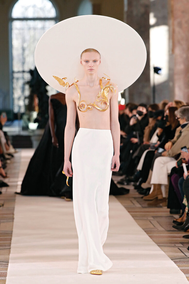 Φυσικά, δεν μπορεί να μην αναφερθεί η χαρακτηριστική σουρεαλιστική προσέγγιση του οίκου Schiaparelli με τις επιχρυσωμένες πλάκες, τις πανοπλίες σε σχήμα γυναικείου στήθους, τα σουτιέν με τους στροβιλισμούς και τα σακάκια με τις χρυσές θηλές, τα οποία έγιναν sold out παντού.