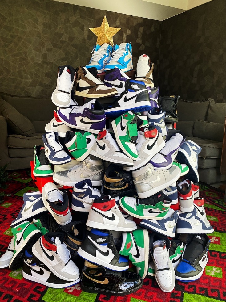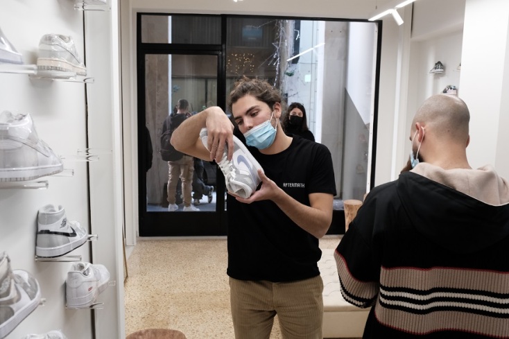 Ο Νίκος με υποδέχεται στο νέο του κατάστημα στην Καρύτση και με ξεναγεί στον χώρο, που η μίνιμαλ αισθητική του αποπνέει ένα χαλαρό και οικείο vibe. Στα ράφια των τοίχων είναι τοποθετημένα τα exclusive sneaker που διαθέτει το AFTERMATH. Παρατηρώ τα λευκά - γαλάζια Air Jordan της Nike, που όπως μου λέει ο Νίκος, ήταν μια συνεργασία της Nike με τον διάσημο σχεδιαστή μόδας Virgil Abloh, που πρόσφατα έφυγε από τη ζωή. «Ήταν ένα από τα πρώτα κομμάτια που απέκτησα, ταξίδεψα μέχρι τη Μύκονο για να καταφέρω να τα αγοράσω, οπότε έχουν ιδιαίτερη συναισθηματική αξία».