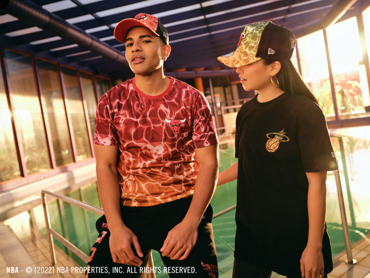 Οι Chicago Bulls αποκτούν μια φλογερή κόκκινη-πορτοκαλί απόχρωση, ενώ οι L.A. Lakers συμβαδίζουν με τα χρώματά τους, το έντονο μωβ και το κίτρινο, με το ντεγκραντέ εφέ των νερών της πισίνας στα καπέλα και τα ρούχα της Summer City συλλογής.