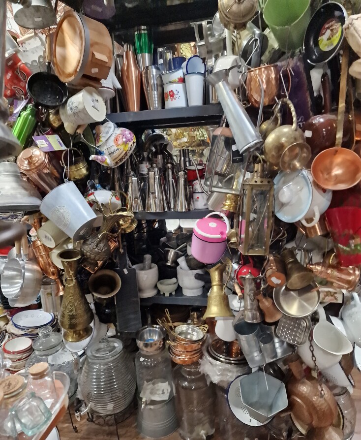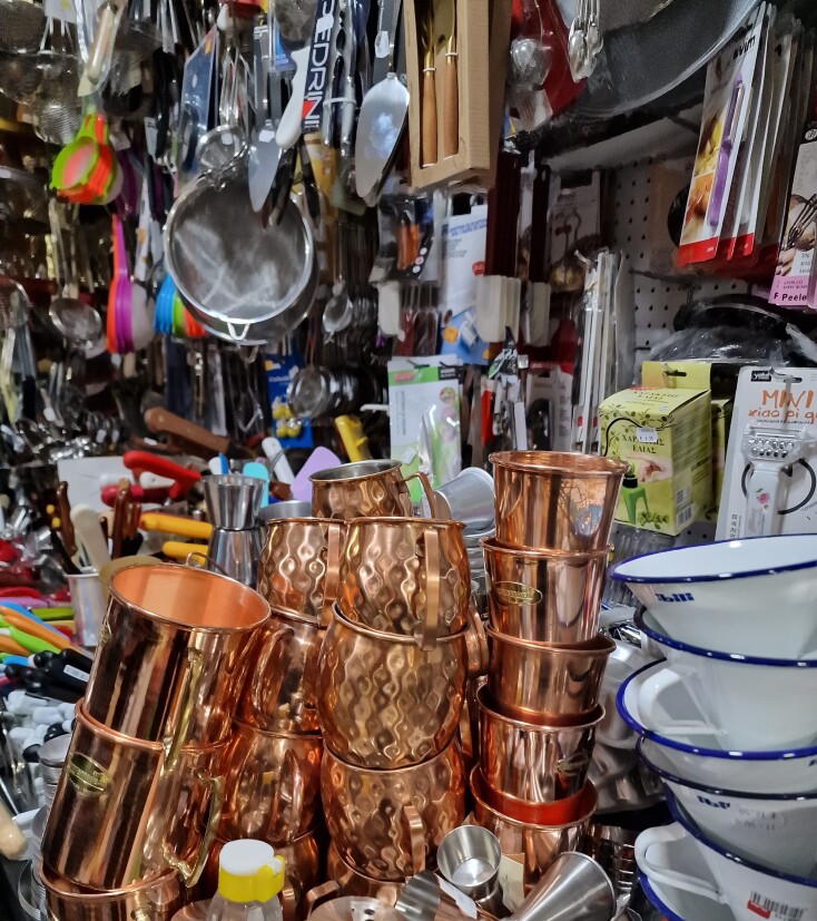 Οι τουρίστες ξετρελαμένοι εκστασιάζονται με τις εγγλέζικες πορσελάνες, τα κεραμικά, τα ταγιέ, τους αλουμίνιους κουβάδες, τα καραφάκια, τους κατρούτσους, τους ζωγραφιστούς δίσκους –μόνο στην Πόλη και το Μαρόκο, σου λέει, έχουν δει τέτοιο «μπαζάρ». Το βέβαιο είναι πως ακόμη κι αν έρθεις εδώ μόνο για το χάζι, θα αποφασίσεις να αλλάξεις σερβίτσιο φαγητού, όλες σου τις πιατέλες, το σετ του καφέ ή του τσαγιού, εν τέλει ολόκληρη την κουζίνα σου. Στα βάθη των αδύτων, θα ανακαλύψεις κάθε λογής γκάτζετ που έχει ως τώρα επινοήσει ο κουζινικός νους, αλλά και όλα τα σκεύη της παλιάς νοικοκυράς –από το καμινέτο μέχρι το παλιό τηγάνι που κάνει τις πιο μαγικές πατάτες, με υπεραγαπημένη την παλιά ΚΑΖΑ, το παλιό φουρνάκι-παππού του Air Fryer, που ψήνει μαγικά και εξαιρετικά. Πλάι τους τα μαντεμένια τηγάνια και οι κοκότ της γαλλικής παραδοσιακής κουζίνας, μέχρι το πιο κινηματογραφικό σετ για έναν ελληνικό καφέ. Πριν αποφασίσεις για το επόμενο δώρο που θα κάνεις, πέρνα από ’δω για έμπνευση αλλά και για κάτι ξεχωριστό σε τιμή value for money.