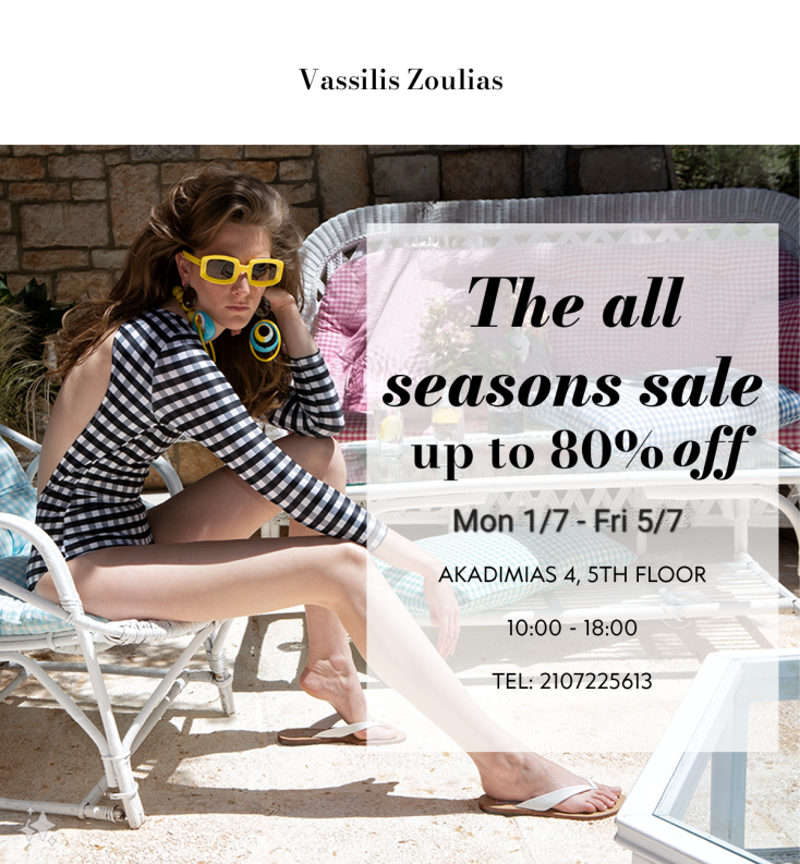 Βασίλης Ζούλιας: Μπαζάρ σε ρούχα και αξεσουάρ του σχεδιαστή με έκπτωση έως 80% από τις 1/7 έως τις 5/7 στο ατελιέ του στην Ακαδημίας 4