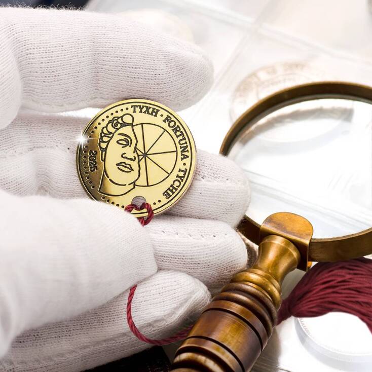 Το Γούρι 2025 TYXH • FORTUNA • TYCHE μοιάζει με νόµισµα και αναδεικνύει τη Θεά Τύχη µε έναν µοναδικό συµβολισµό: το πρόσωπό της είναι µισό, αποτυπώνοντας το στοιχείο του απρόβλεπτου και του µυστηρίου που τη συνοδεύει. Η σύνθεση, σε συνδυασµό µε το πηδάλιο που κρατούσε, τον γνωστό “Τροχό της Τύχης”, υπογραµµίζει την ισορροπία ανάµεσα στο γνωστό και το άγνωστο... Στα γούρια, η φούντα δεν είναι απλώς ένα διακοσμητικό στοιχείο· ταυτίζεται με τα χρήματα και ενσωματώνει την ευχή για οικονομική ευημερία, επιτυχία και άνοδο. Tip: Μπορείτε να το δωρίσετε σε όποιον/α κερδίσει το φετινό φλουρί!